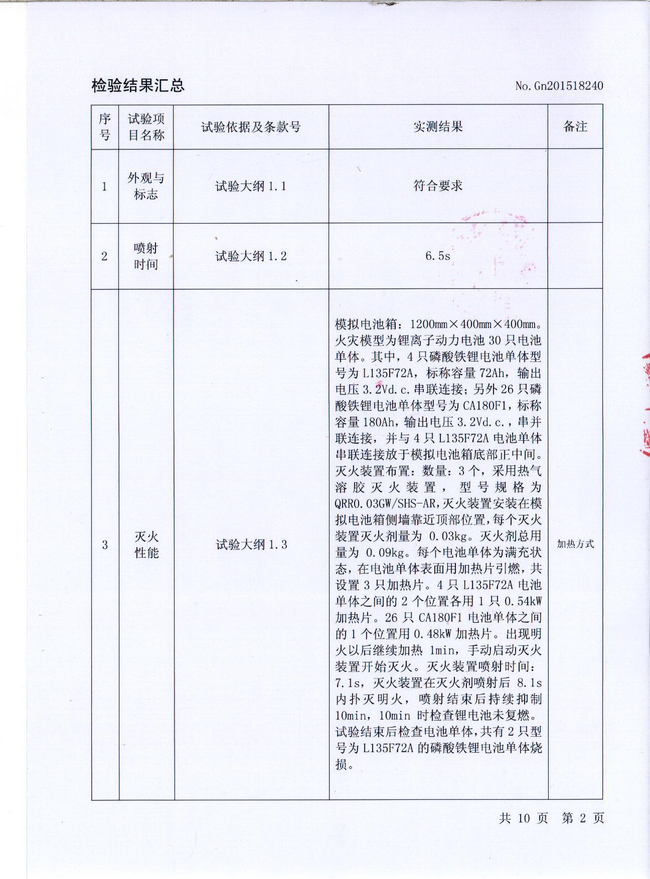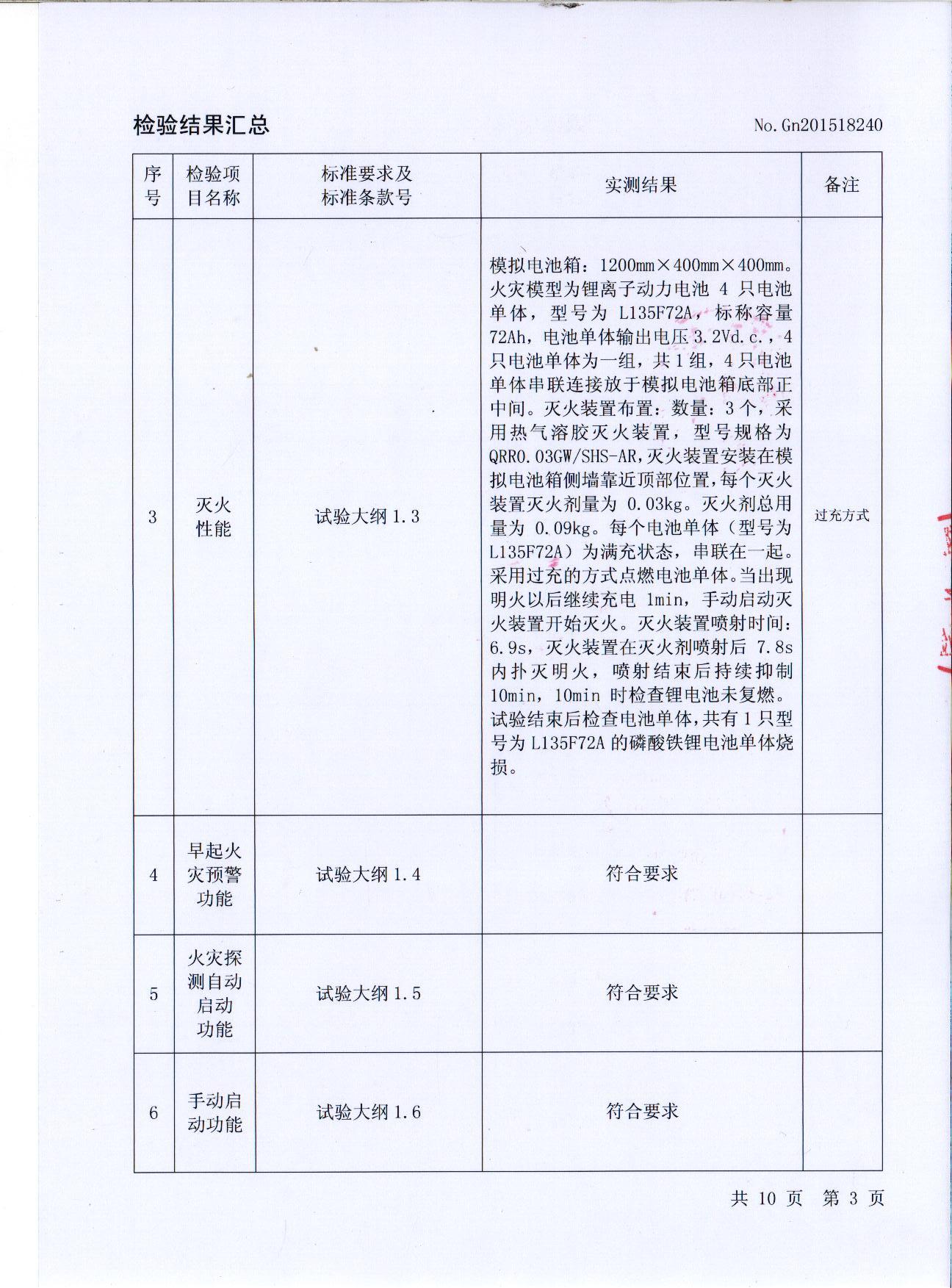 根據(jù)1:1模擬電池箱電池成組滅火試驗(yàn)測(cè)試,電池箱專用自動(dòng)滅火裝置在外觀與標(biāo)志、噴射時(shí)間、滅火性能、早期火警預(yù)警功能、火災(zāi)探測(cè)自動(dòng)啟動(dòng)功能、手動(dòng)啟動(dòng)功能等方面的功能設(shè)定均符合測(cè)試大綱要求,達(dá)到國(guó)家要求的技術(shù)標(biāo)準(zhǔn)。