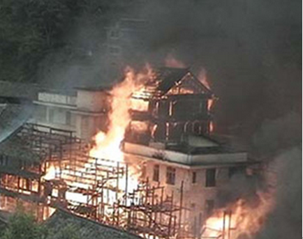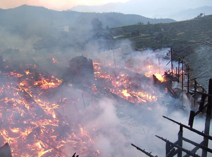 2013年3月,云南麗江古城光義街現(xiàn)文巷突發(fā)火災(zāi),燒毀民房107間;2013年4月,湖南鳳凰古城發(fā)生大火,由于消防通道狹窄無法迅速撲救,幾棟古房屋及其內(nèi)酒吧被徹底燒毀;2017年4月,古城一處街角再次發(fā)生火災(zāi);2013年8月,湖南靖州苗族侗族自治縣一古村寨發(fā)生火災(zāi),共造成58戶、248名村民房屋被燒毀;2013年10月,湖南洪江古商城清代古建筑“曾國藩兵服廠”旁一棟老民居突發(fā)大火,11戶居民無家可歸;2013年12月,洪江古商城建于清末民初的朱志大油號(hào)舊址在一次大火中付之一炬,造成22戶67人受災(zāi);頻發(fā)的火災(zāi),不僅給人民生命財(cái)產(chǎn)帶來損失,而且許多被燒毀的建筑都有上百年歷史或獨(dú)特民俗,具有較高的歷史文化價(jià)值。在廣西三江侗族自治縣,許多古村落近年來頻遭火魔侵襲,有的甚至徹底焚毀。