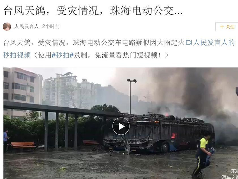 2017年8月23日,微博用戶@人民發(fā)言 人上傳了一條視頻,其內(nèi)容為: “臺(tái)風(fēng)天鴿,受災(zāi)情況,珠海電動(dòng)公交車電路疑似因大雨起火”。