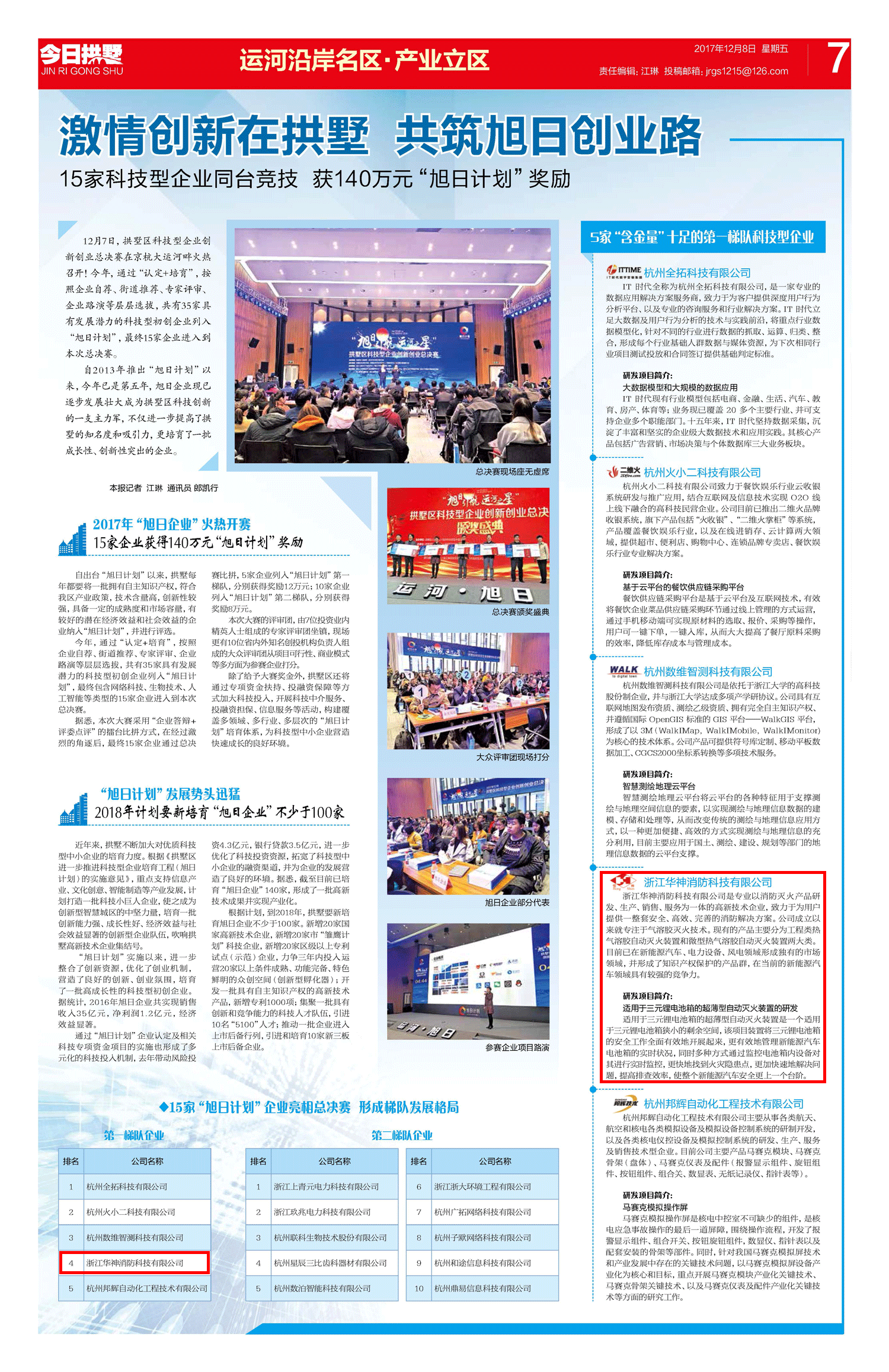 次日,活動的獲獎名單及第一梯隊的獲獎企業(yè)簡介等在《今日拱墅》日報中報道。